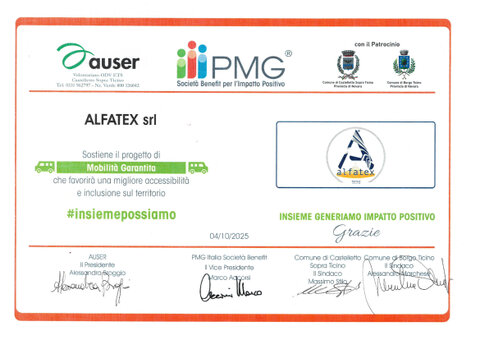 ALFATEX sostiene il progetto di "Mobilità Garantita" che favorirà una migliore accessibilità e inclusione sul territorio di Borgo Ticino e Castelletto Sopra Ticino. Dal 11/10/2025 è stato attivato un nuovo mezzo per il trasporto disabili.